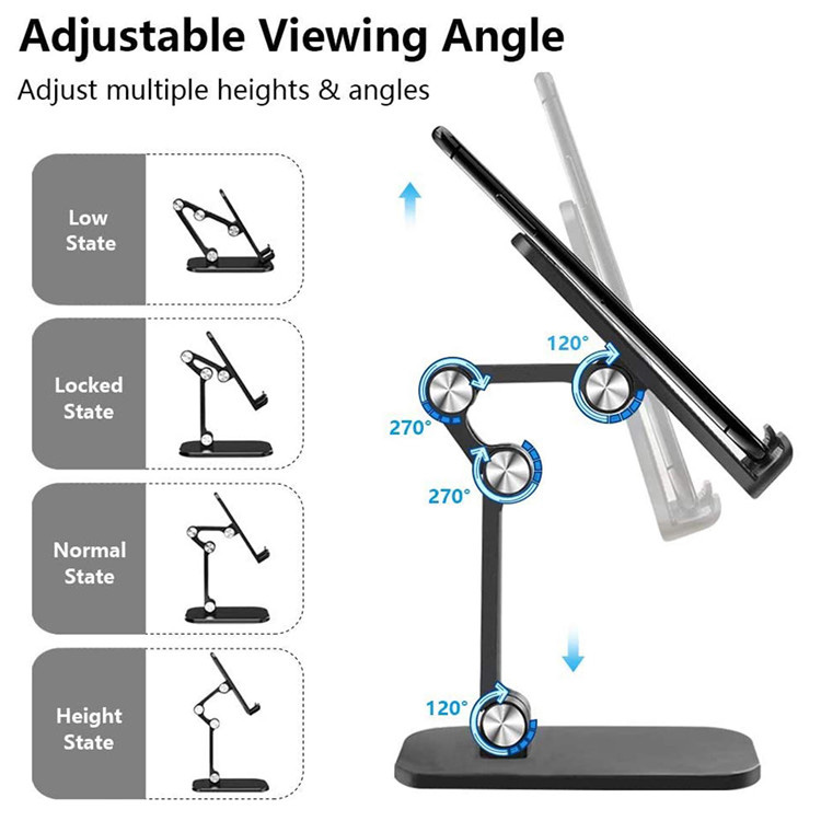 Эта складная настольная подставка для мобильного телефона с регулируемым углом наклона, искусно изготовленная из высококачественного алюминия и АБС-пластика, отличается повышенной прочностью. Он оснащен качественной нескользящей резиной, покрывающей переднюю и нижнюю часть, обеспечивая максимальную защиту телефона от скольжения и царапин. Его устойчивая конструкция позволяет касаться экрана, не опасаясь опрокидывания или падения. Совместим со смартфонами с диагональю от 4 до 12,9 дюймов и большинством планшетов в чехлах, включая популярные модели, такие как iPhone 11 Pro, Samsung Galaxy S20, LG, iPad и другие. Он предлагает регулируемую высоту (3,74–5,5 дюйма) и гибкий диапазон угла наклона от 0° до 235° вручную, обеспечивая удобный угол обзора для просмотра фильмов, приготовления пищи, чтения, игр и многого другого.